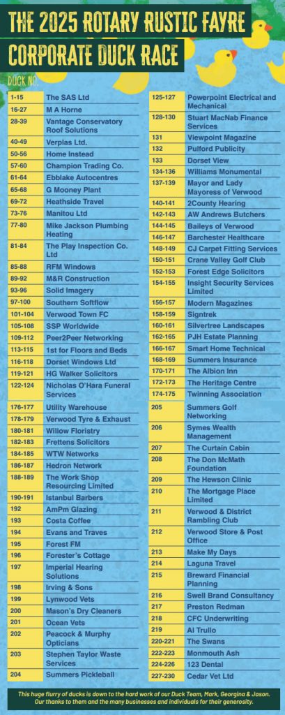Sponsor your ducks at the Rustic Fayre Duck Race and see your company’s name in the list of winners!